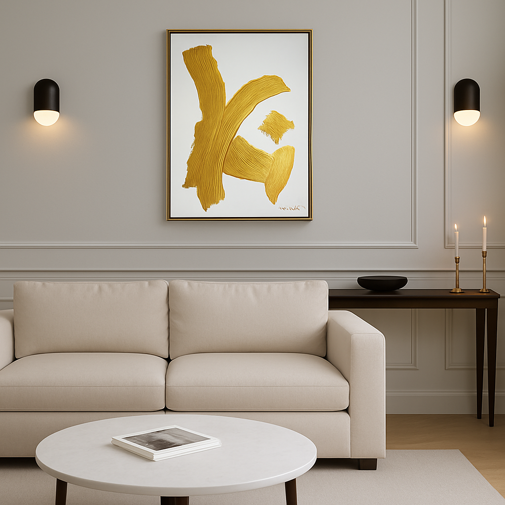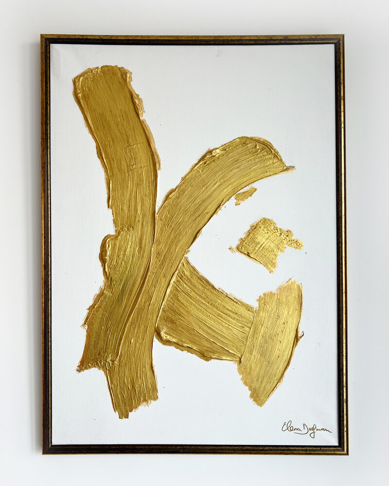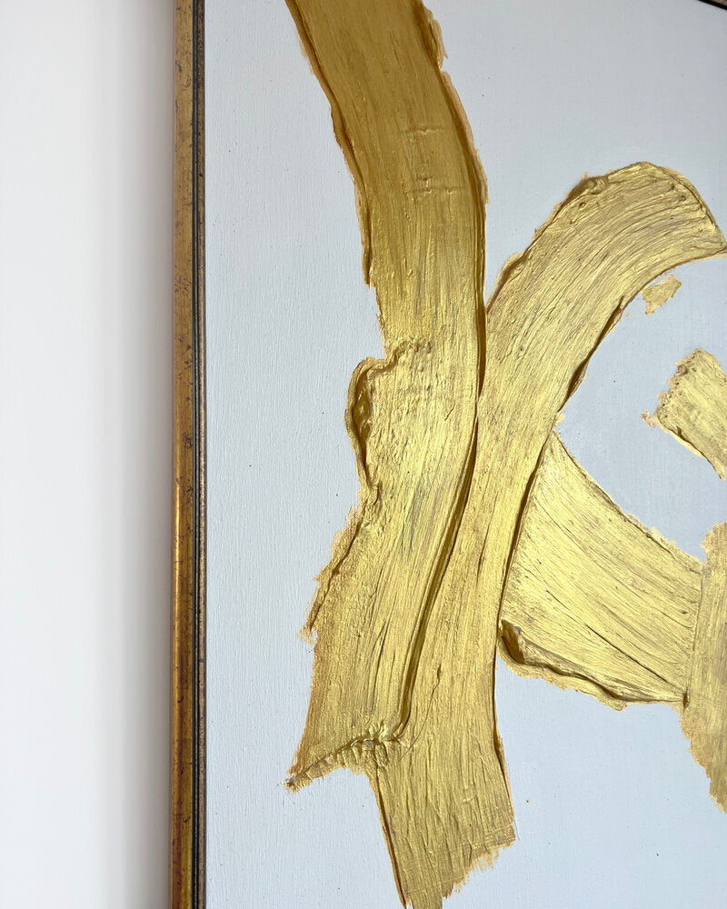 The painting comes with a wooden frame in a gold tone, featuring a gently aged, antique-style finish.